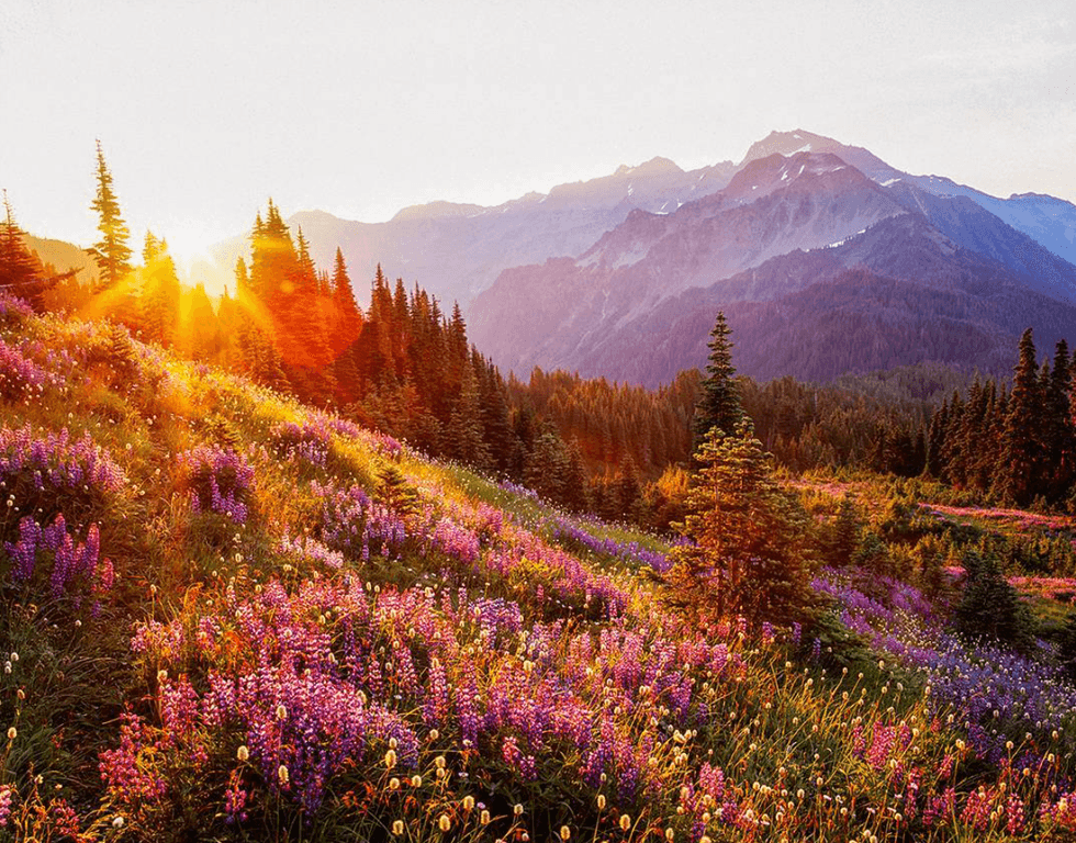 Sunrise illuminates the meadows that line the High Divide in Olympic National Park every morning. Created in 1938, the park is 95 percent forested and contains numerous different types of terrain. Diversity is the hallmark of this park. This trait is expressed in the spring as the local flora begins to bloom, creating a natural watercolor painting along the hillside.