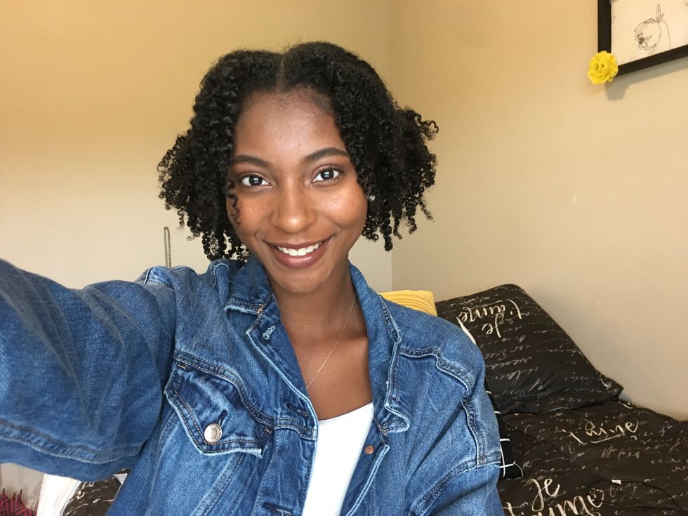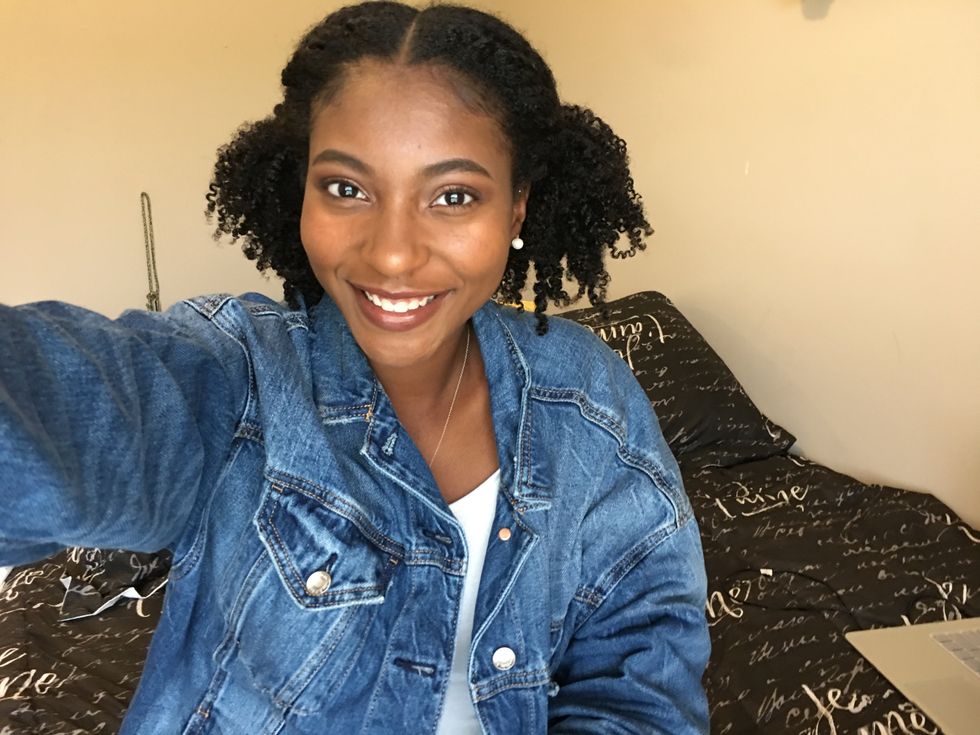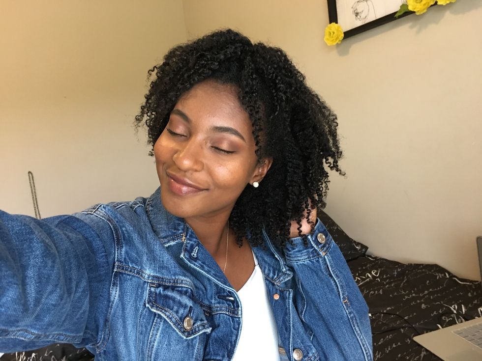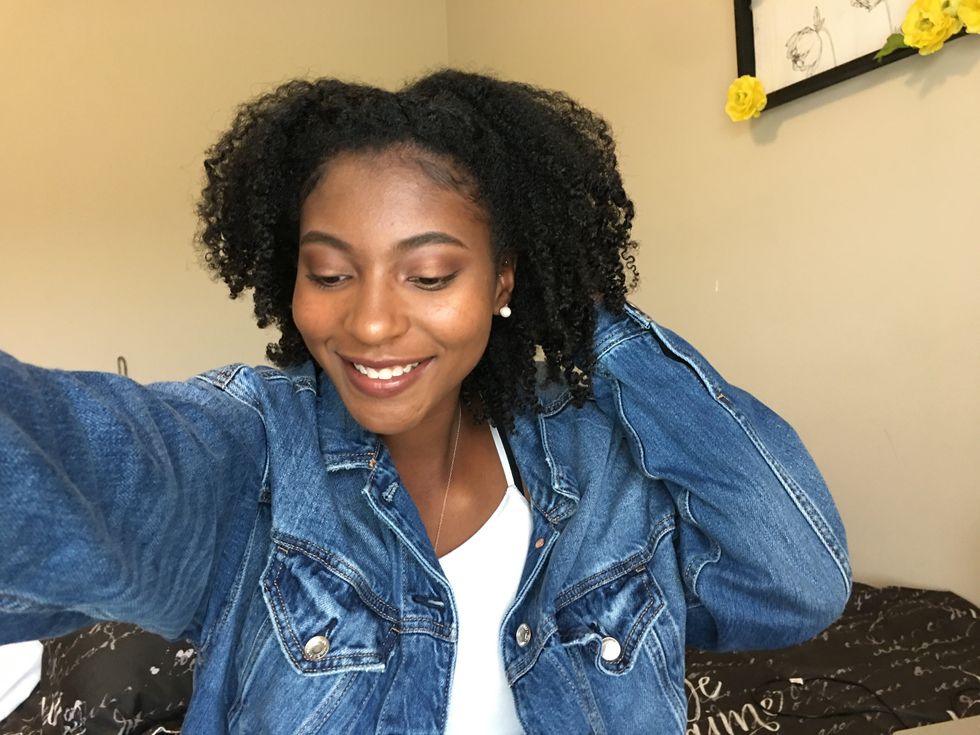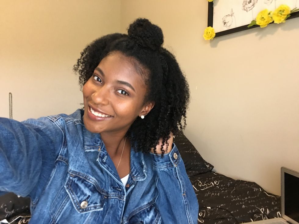 part hair in the middle and put it in low pigtails and leave your curly bangs out and it gives you a cute effortless look. It's an easy go to if you are running late for class.