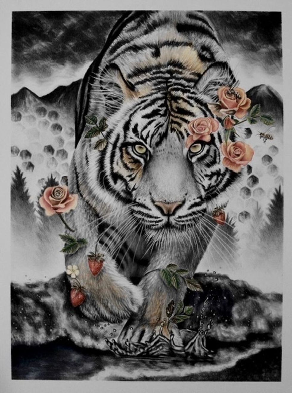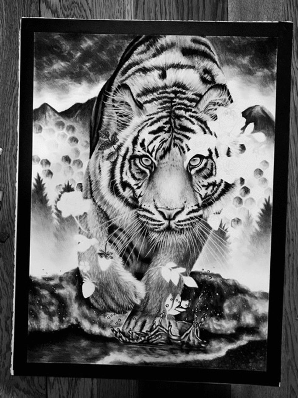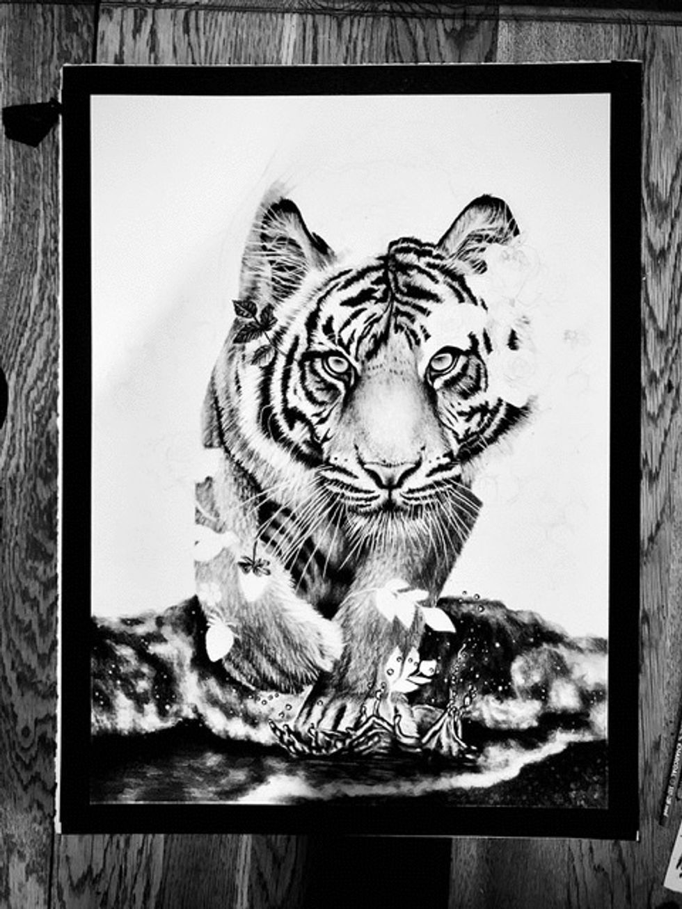 The background and water splash was super fun to work on after drawing fur for hours on end! I knew I wanted the background to be beautiful and add a lot to the work, but also not take away from the tiger, which is the focal point of the drawing.
