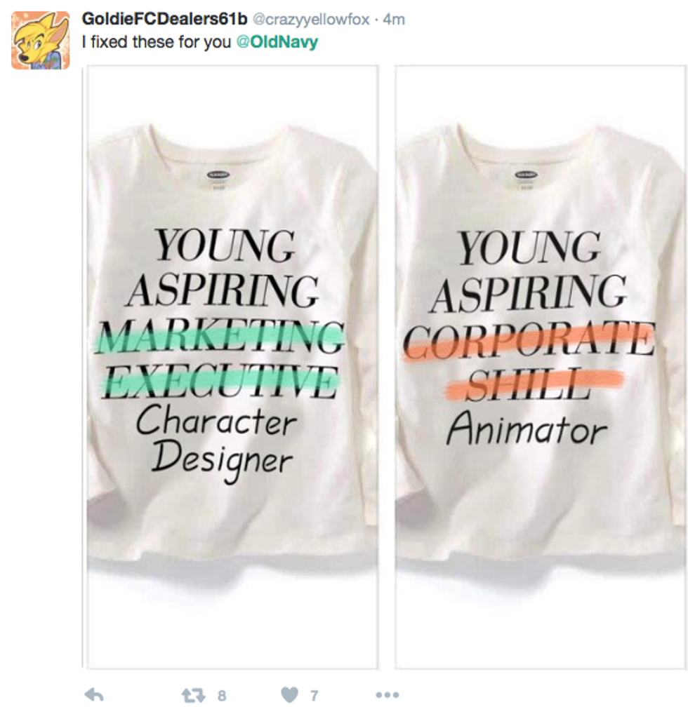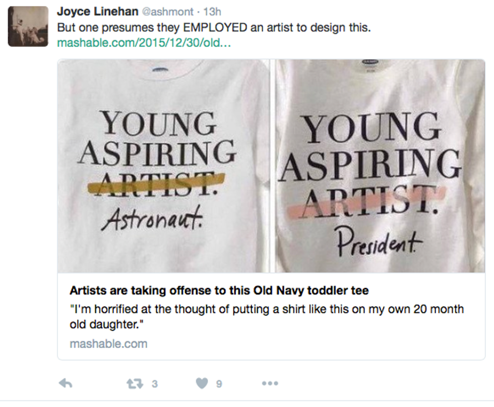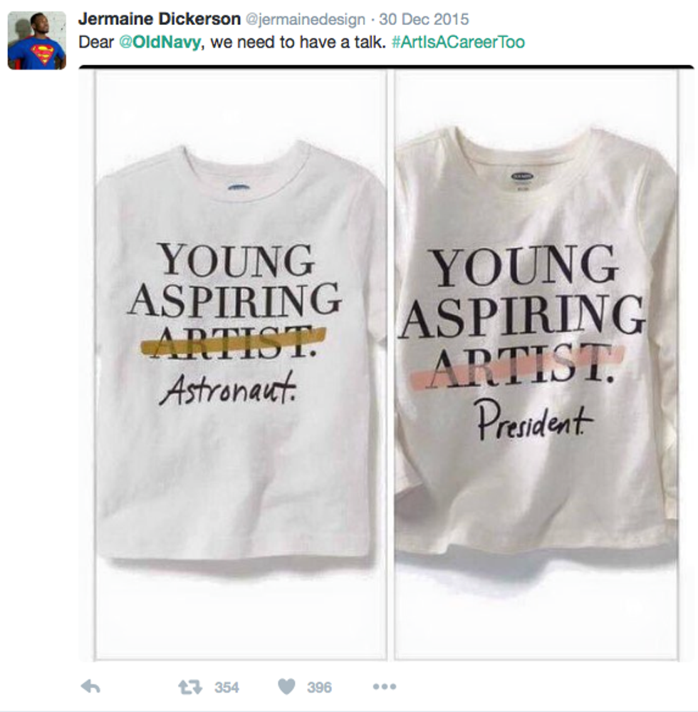So, Old Navy I think we all learned a lesson here: think before you release offensive T-shirts that are taking a dig at some people's actual careers. Kids should aspire to be whoever they want to be whether that be an astronaut, a president or an artist.
