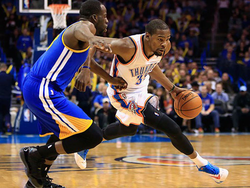 Durant’s raw numbers (28.2 PPG, 28.2 PER, and 63.4 true shooting percentage) rank third, second and second, respectively in the entire NBA, but it’s the threat he poses as a spot up option and his work off the ball that gives him the advantage over Westbrook’s hypercompetitive, athletically-infused triple doubles. Also Westbrook’s maniac blitzkriegs in jumping passing lanes and tendencies to space out defensively can leave the Thunder vulnerable at that end. Durant isn’t a shining example of exemplary NBA defense and doesn’t produce the vineable defensive feats Westbrook does, but he’s improved tons at that end, and when he’s locked in, Durant’s length, athleticism and ameliorated footwork can make him an enviable wing defender.
