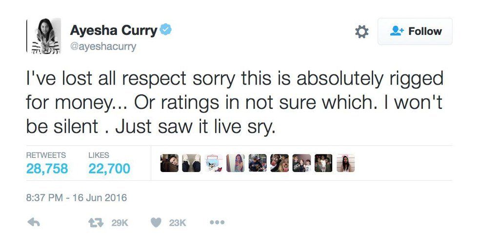 "I've lost all respect sorry this is absolutely rigged for money...or ratings in not sure which. I won't be silent . Just saw it live sry."