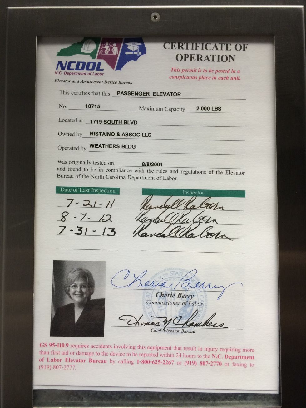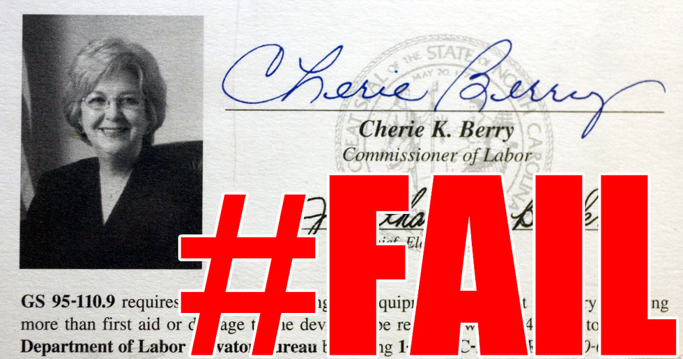 Her face is familiar to all North Carolinian elevator passengers, and she likes it that way. In 2005, N.C. Commissioner of Labor Cherie Berry, now in her fifth term, instituted a rule requiring each elevator's Certificate of Operation to include the labor commissioner's portrait and signature. According to an N.C. Labor Department spokesperson, the measure aims to "put a face on state government." However, this policy does not exist in other states. In a 2009 Q&A, Berry was asked whether having her likeness in every elevator was an effective campaign strategy. Her response aligned with that of her spokesperson, but Berry admitted to being "sure the photo does help with name recognition."