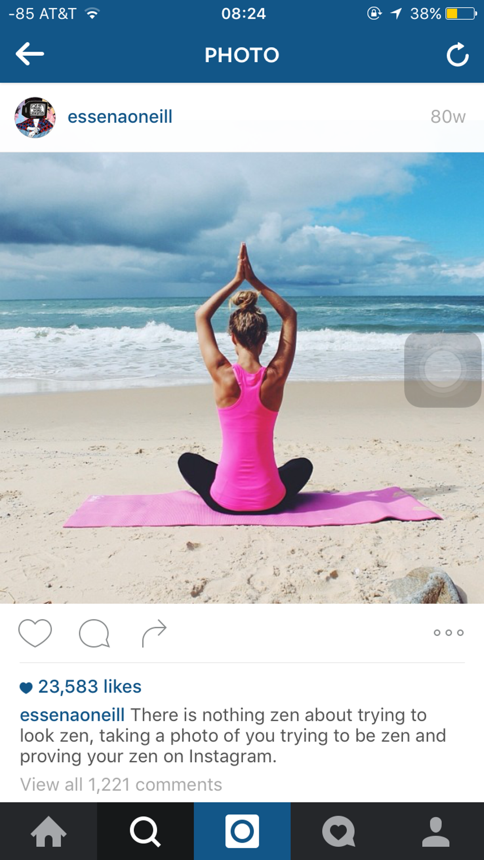 When I was a sophomore in high school I simultaneously discovered Essena O’Neill on Instagram and developed a love for nutrition and fitness. For those who have never heard of Essena, her Instagram post consisted of bikini photo shoots, inspirational quotes, beach-y yoga pictures, and more- everything I loved. I fell in love with Essena account as soon as I stumbled upon it on the popular page and never missed a post from that day forward. She became my Instagram "goals", and from that moment on I wanted my Instagram to look exactly like hers.