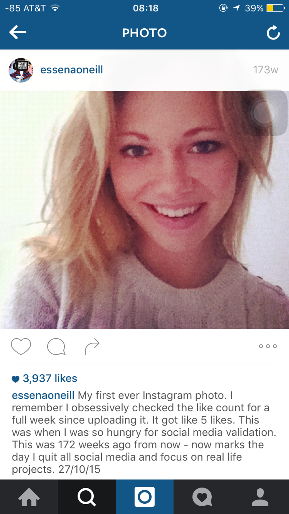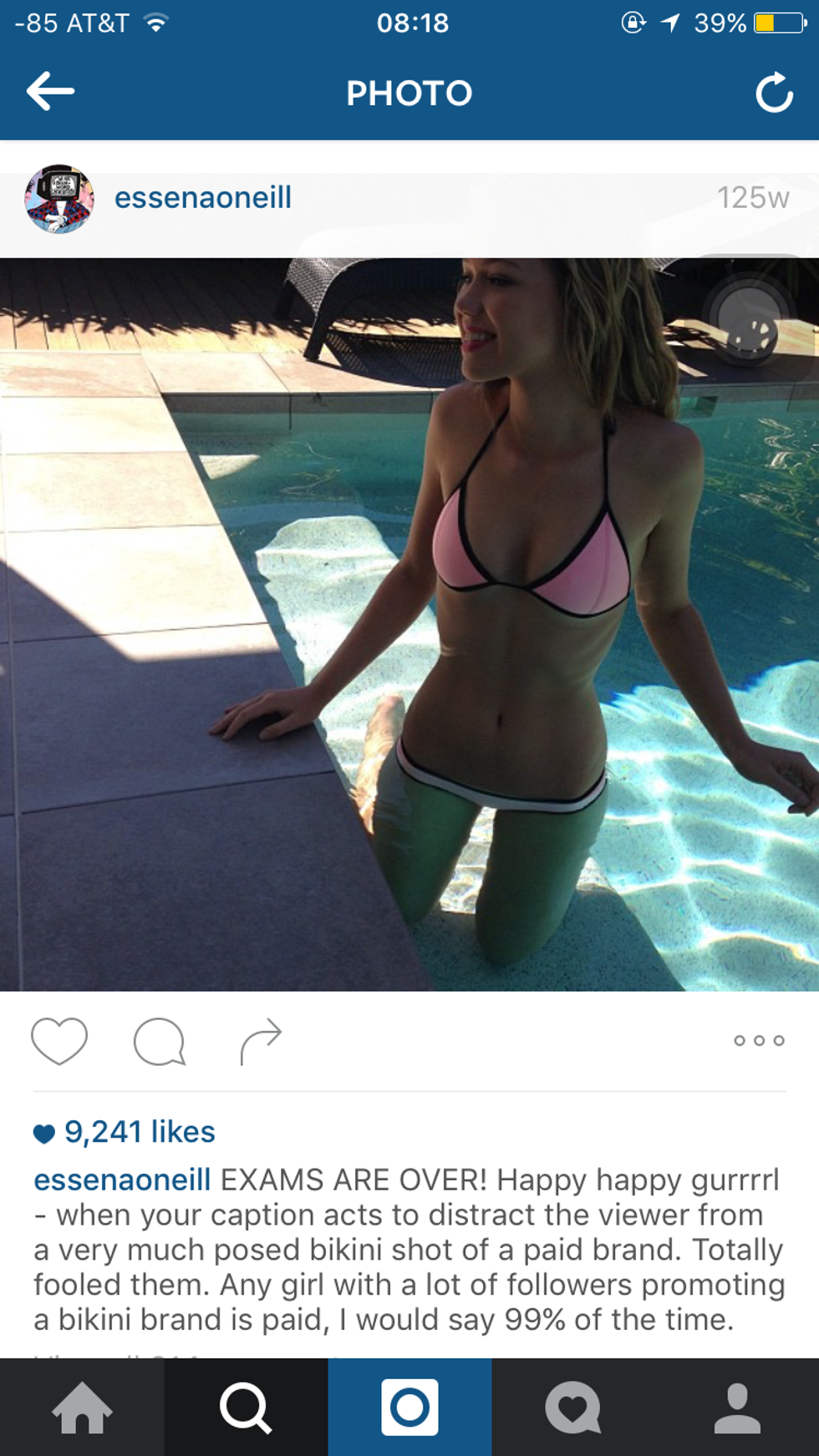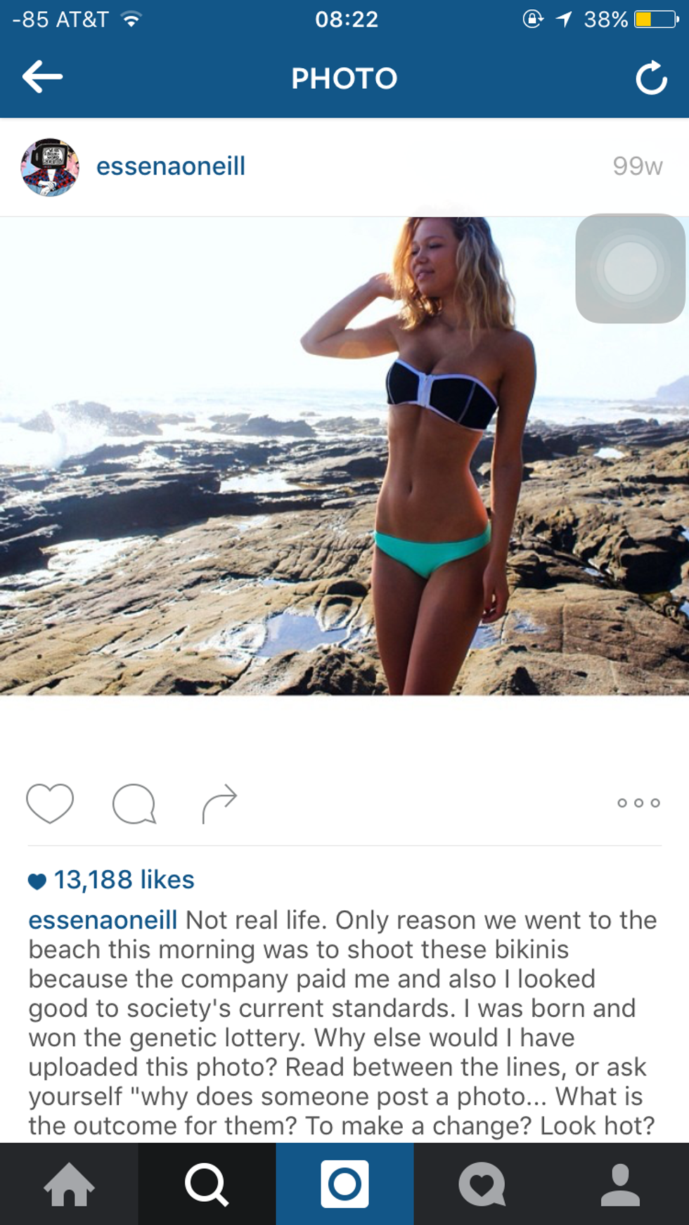 Essena describes how she would force her sister to take over 100 photos of her every day just to get the “effortless” selfie look and appear perfect. Boobs out and thigh gap evident were obvious necessities in order to promote a product and get the appropriate amount of likes. In her very first posts, she was only 15. Despite being the exact same age as Essena I always saw her as an older, sexier version of who I aspired to be.