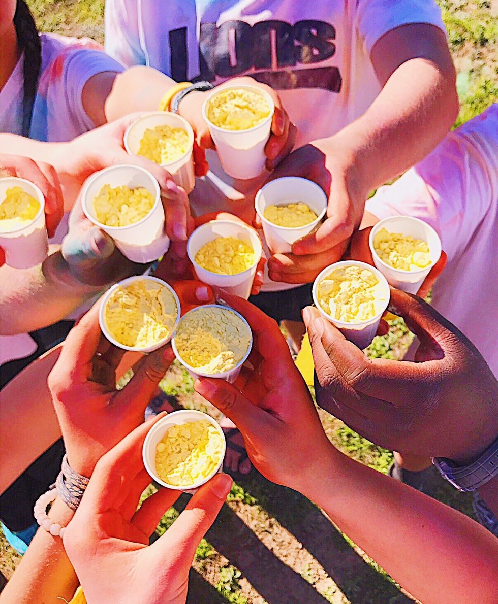 At the beginning of the color wars, I was tasked with filling bags with colored powder of each color in preparation for various events. I began with orange, and naturally my palms looked as if I had just gotten a bad spray tan. My shirt was slightly tinted, but the powder dusted right off. Then, as I moved to yellow and then blue, I noticed the hue of my skin was darkening and darkening. By the time the games were ready to begin, my hands were almost blackened, and my shirt had a plethora of colors already on it, removing the original purity of the crisp white tee. The beauty was gone once the colors had all been tested, and it took a lot of scrubbing to rid my palms of the black mixture of colors.