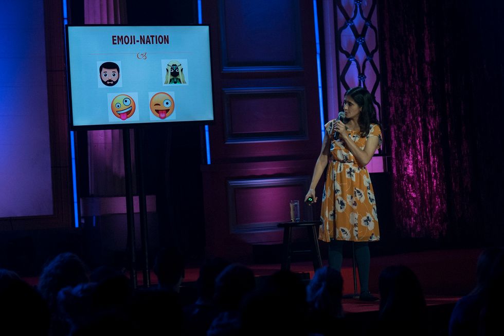 Aparna Nancherla has a tool that many skilled stand-up comedians today lack: a Powerpoint. It works in a way; it's something that many stand-up comedians don't typically pull out, so it's definitely a change when Nancherla introduces her powerpoint with "This is just called, 'You Had Me At YOLO'... This is just going to be 'a tenuous exploration of how digital language exists in an ever-evolving landscape,' which of course is a title I got from a random TED Talk title generator."