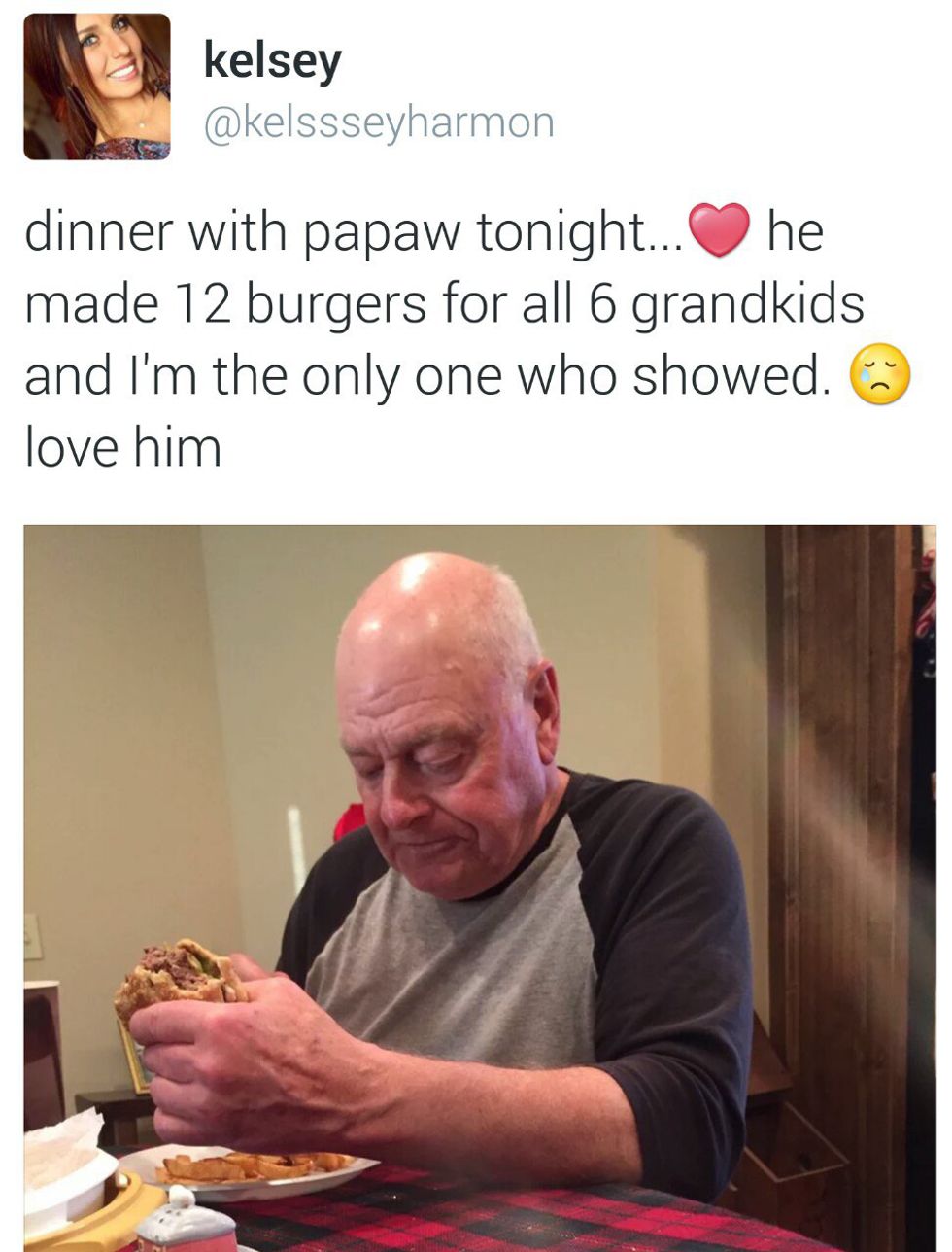 One post that originated on Twitter has been circulating through the social media world, and it probably made us cry, made us angry, or made us want to go visit our family members. That post is from a girl who went to eat dinner with her Papaw, who cooked burgers for all his grandkids, but she was the only one who showed up.