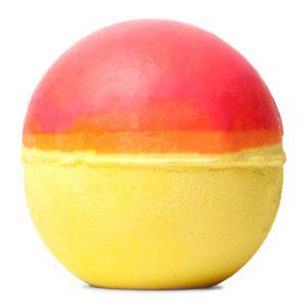 Priced at $7.95 U.S. Dollars, Lush describes this bath bomb/bath melt combo by saying, "These aren’t ingredients for anybody else except yourself. Lime and sweet wild orange oils are fresh and peachy on the nose, exciting the senses and shaking up your mood. There’s no time for apathy in the bath, so this anarchic bath bomb fizzes and rolls and spews color with a no-holds-barred energy. Fair trade cocoa butter melts alongside fresh bananas to soften both the water and your skin. You'll want to put this one on repeat."