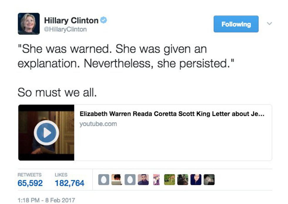 In his remarks, Senator McConnell said of Senator Warren, "She was warned. She was given an explanation. Nevertheless, she persisted." This short statement has added a fuel to the fire that is the modern-day feminism movement. After the event took place on the Senate floor, millions of females shared their stories of being silenced. Even former Presidential candidate Hillary Clinton tweeted in support of Warren.