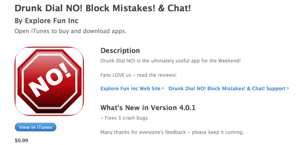 I know what you're thinking.. "Yeah it'll keep me off Twitter, but what about the text I sent to my ex?" Luckily, there's an iPhone app for that too. It's called "Drunk Dial NO!" and it hides the phone numbers and addresses from contacts of your choosing for 1 hour up to 48 hours! (a.k.a. the whole weekend, which could be the better option.)