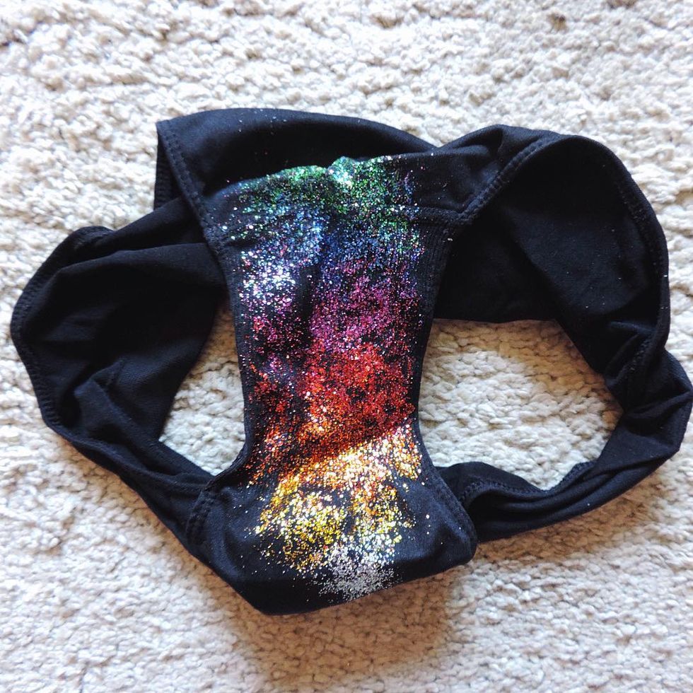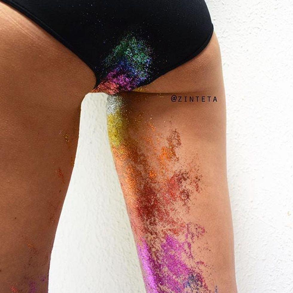 Well our lovely artist decided to combat the harmful “body shamers” by taking these natural (but less appealing) things and combining them with two aesthetics that everyone loves: rainbow and glitter. And you know what? It’s freaking glorious. Coming from somebody who has her fair share of stretchmarks I can say that I love the rainbow approach because it makes them seem fun and festive. It makes light of an insecurity I have, and I feel like it might for others too. The same goes for the period stains. Her work shows ladies in their underwear with rainbow crotch stains and shimmery glitter running down their legs. Glitter makes everything shiny, even the dullest parts of life.