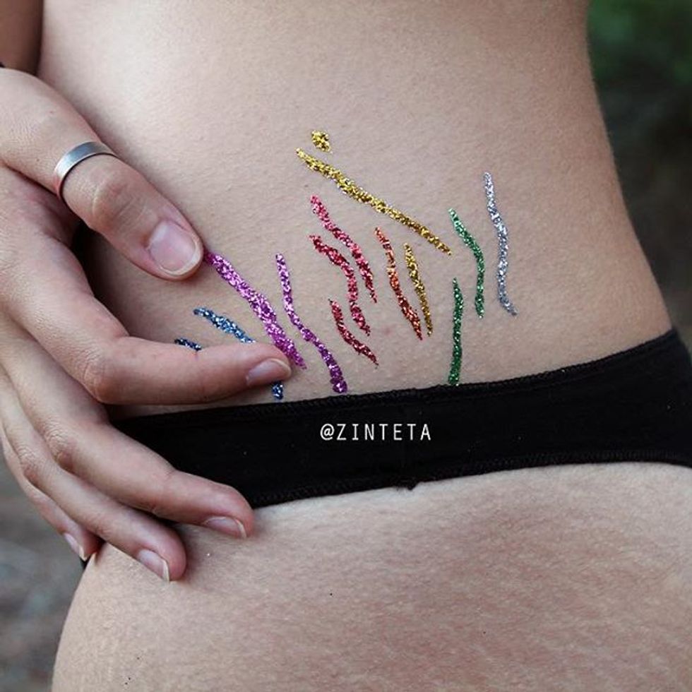 Spanish artist Cinta Tort Cartrό has made quite a splash in the art scene. She has taken stretch marks, period stains, and the idea of “gross/unsavory” things about the female body and made them bright, colorful, and glittery. While some people absolutely love this fresh new outlook, some people meet it with disgust or make jokes in poor taste. Really, it seems to come down to what you are getting from this art and what you think it means. For many people, this bright trend symbolizes acceptance and body positivity.
