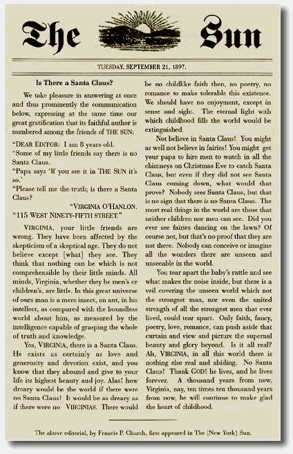 2. The New York Sun proved that there is a Santa Claus in 1897 when an editor answered a letter from a little girl, to which he replied, "Yes Virginia, there is a Santa Claus."