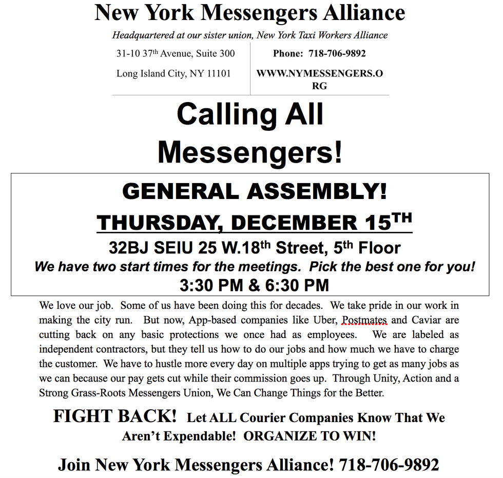 The New York Messengers' Alliance will be holding its first general assembly meeting on December 15th! All manner of bike and walker messengers, from any and all companies, are welcome and strongly encouraged to attend.