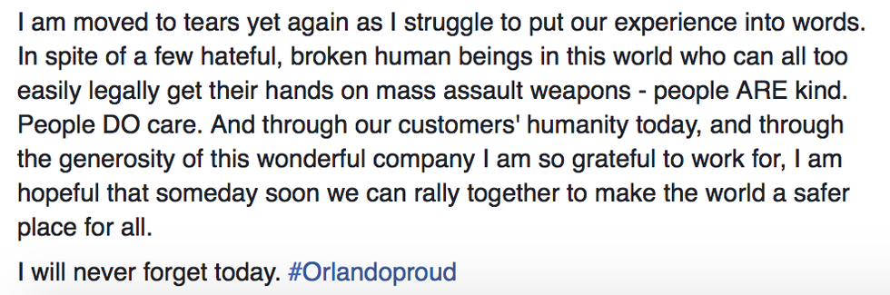 On Facebook, a JetBlue flight attendant made a status about her flight to Orlando with the grandmother of one of the victims of the Pulse shooting. The staff on the flight wanted the grandmother to feel as much of their empathy as possible, accommodating to her every need so that she would not feel alone. The other passengers on the flight passed around pieces of paper to write messages for her, held a moment of silence for her grandson and every single passenger stopped to give her their condolences upon arrival in Orlando. Captured perfectly through her status, flight attendant Kelly Davis Karas writes, "In spite of a few hateful, broken human beings in this world who can all too easily legally get their hands on mass assault weapons -- people are kind. People do care. I am hopeful that someday soon we can rally together to make the world a safer place for all."