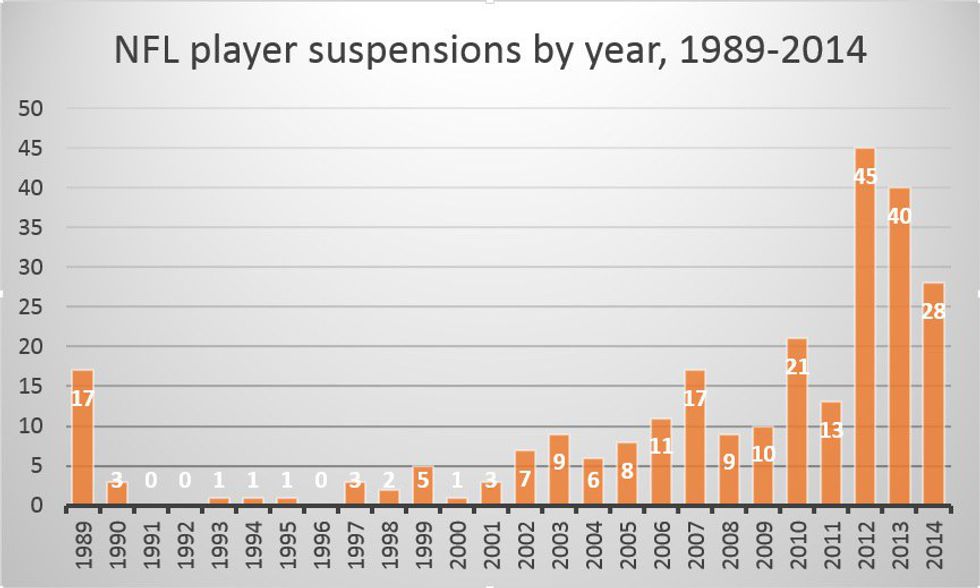 As you can tell by this chart, suspending players clearly isn't encouraging them to behave better. Has the NFL gradually suspended more players because they are cracking down on drug abuse and domestic violence? It's possible, but it still shows that those problems exist. So instead of punishing their players, why doesn't the NFL help them so that they don't have to face a suspension?