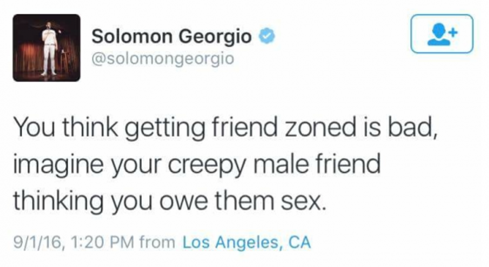 So what happens when you reject these needy, pathetic guys? They start whining about another fundamentally sexist social construct: the "friendzone." This magical zone functions as some sort of romantic limbo, and is usually all in the nice guy's head. If you reject a nice guy, you are, in their words, shallow. Or, you "don't know what you're missing." These 'nice guys' tend to go for women already in relationships as well, like parasites trying to leech off of relationship problems. There's an unmistakable parallel they seem to draw between women and property, as if they're entitled to women after being nice. I mean, come on, women are not ATMs; it's not a right to deposit kindness and withdraw sex from women.