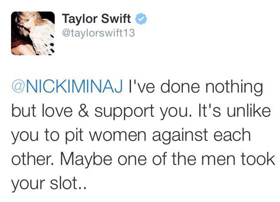 This lack of awareness was manifested in Taylor Swift's response to Minaj's tweets when she felt personally attacked by them: