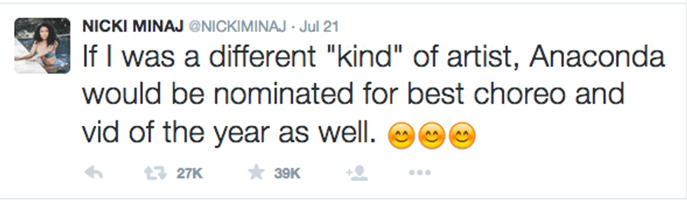 And she's right. Think about Miley Cyrus's video for "Wrecking Ball," which is also considered provocative. "Anaconda" surpassed "Wrecking Ball" for first-day views on Vevo, and Miley still won Video of the Year at the 2014 MTV Video Music Awards. Even "Blurred Lines," a possibly more sexualized but definitely more controversial song and video, has been acknowledged, being nominated for Video of the Year in 2013. So why didn't Nicki get nominated for a video and song that reached EVERYONE? Because the media disregards the talents of black female artists but doesn't want to come out and blatantly say it.
