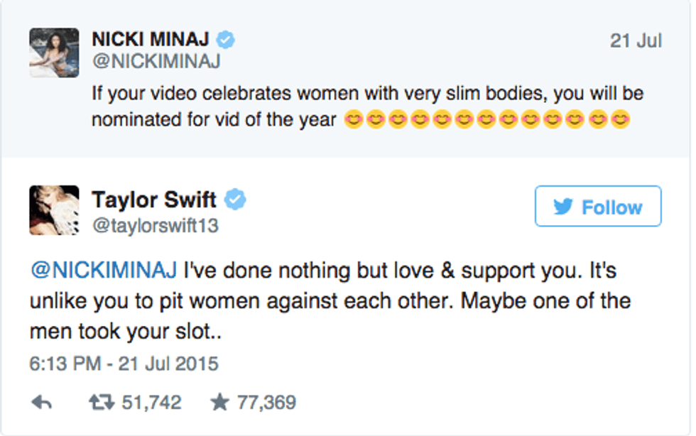 By now everyone has heard about the "feud" between country-turned-pop superstar Taylor Swift and rap/hip-hop phenom, Nicki Minaj. In case you missed it: Nicki took to Twitter to talk about not being nominated for the MTV Video of the Year at the VMAs, reiterating the racism in the media that is all too ignored: