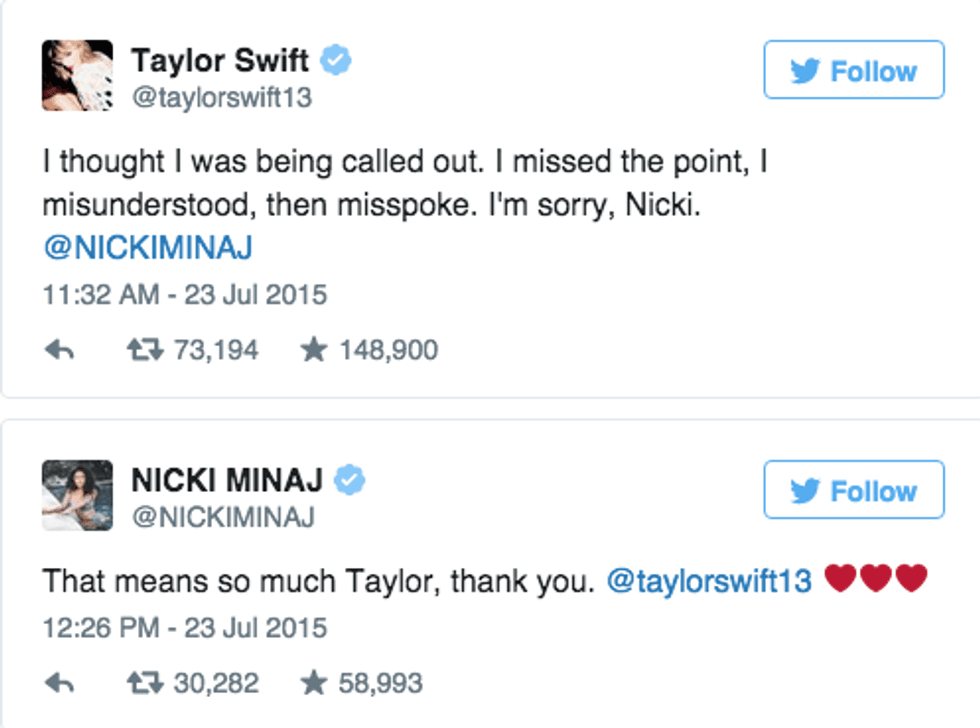 Anyway, Tay Tay responded to Nicki in what is slowly becoming "The Tweet Heard 'Round The World." The issue: Taylor completely missed the point of Nicki's tweet. But they made up, and Taylor apologized to Nicki, gracefully stating she missed the point, and Nicki responded with hearts and love, mending this "broken friendship" of sorts.
