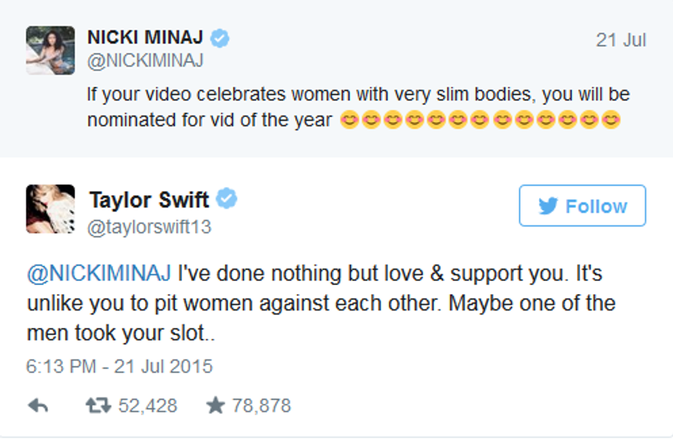 If you’re one of Nicki Minaj’s nearly 20 million Twitter followers, or one of Taylor Swift’s nearly 61 million, or even a casual social media user, you’ve probably witnessed the uproar over Minaj’s response to the VMA Nominations.