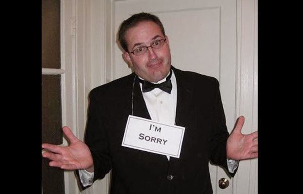 A formal apology. Isn't that fantastic? All you need is your fanciest attire and an apologetic attittude. Forget the sign if you're really strapped for time. Just apologize all night and see if anyone picks up on your pun.