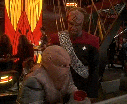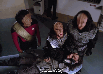 Klingons love to yell. These ones above are yelling because it's a really bad pun in Klingon that makes everyone groan. It's old hat and over used, but it does offer a good insight into the culture, so it's good to know. Also, it reminds me of my roommate's theory of Vulcans and their propensity to mind-meld with the dying (specifically Spock, but that's irrelevant) alongside their link of seeming-abstinence for about seven years. She's implying something there.
