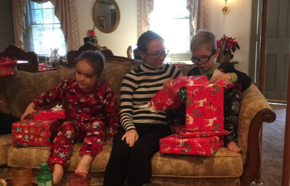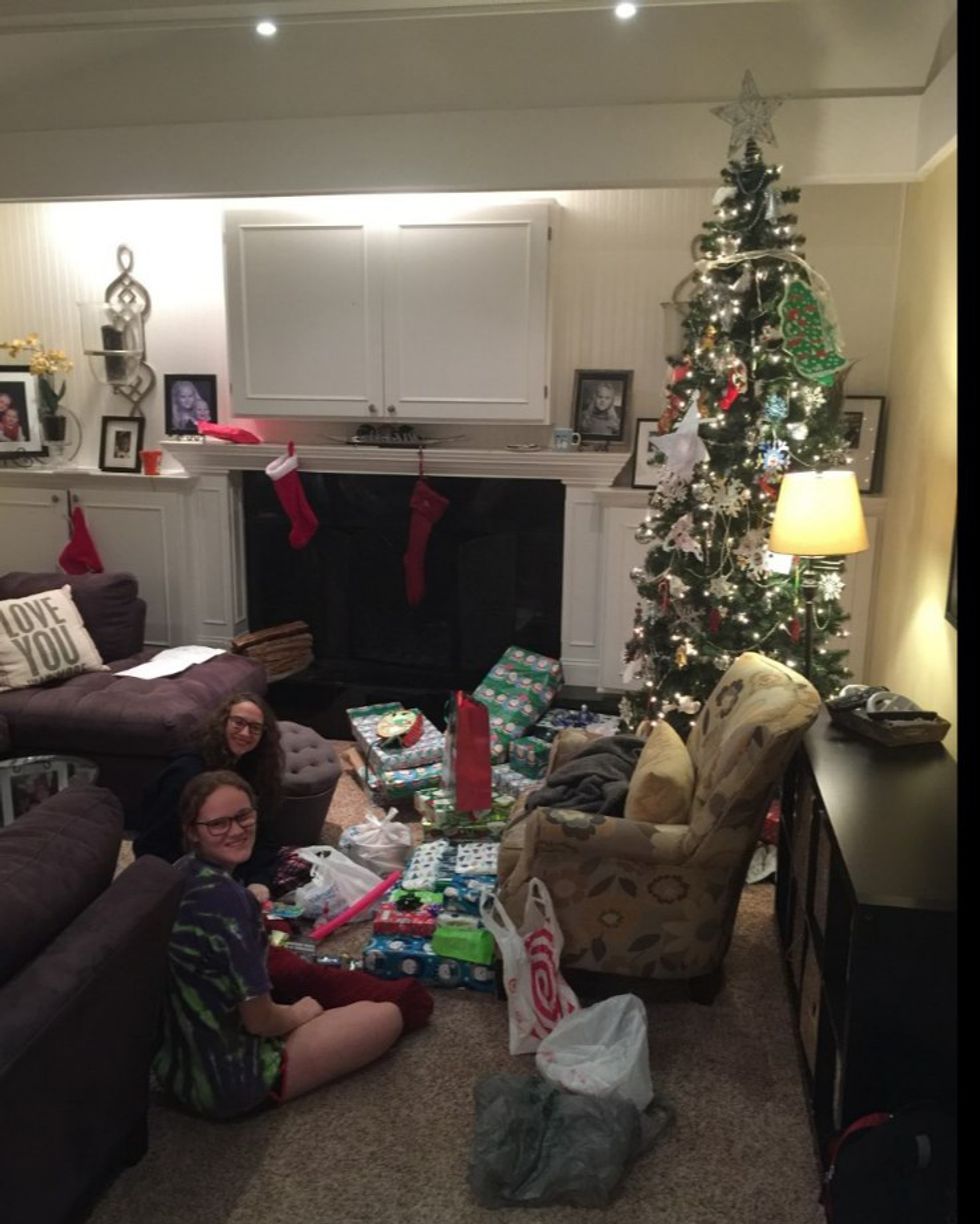 That evening, my roommate, her mother and I went to work by making all of the behind the scenes action come to life for the little kids. All of Santa’s gifts were carefully wrapped in paper adorned with his very own printed pattern, to distinguish the givers. We stuffed stockings full with candy, gift cards, candy, fun toys, and even more candy for every member of the household. Her sister had made me my own stocking, covered in glitter and made with love. Even the beloved little furry pal, of an unknown breed, got in on the action with his own stocking complete with a bone and squeaky toy. Looking at all of the presents under the tree gave me such a feeling of joy. Not only were there the gifts I had picked out for her family, but her family goes so hard during Christmas that there were enough gifts for me as well to make up for every Hanukkah I missed out on growing up. I walked up the stairs that night with a full heart, excited to see the look of joy on her younger siblings faces’ as they took in all the magic downstairs that I helped create.