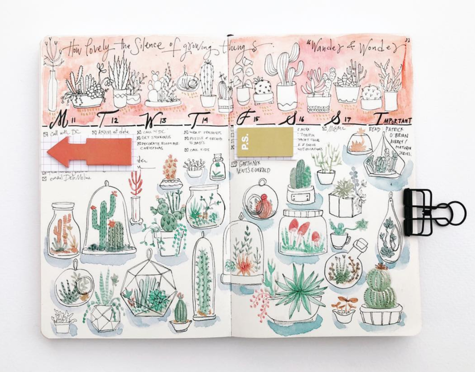 The doodling, as shown below, is optional, but I've never seen a bullet journal without it. Whether it be pictures depicting daily tasks, wishes for the future, or just cute little pics, like these adorable succulents, doodles seem to make the journal an actual journal.