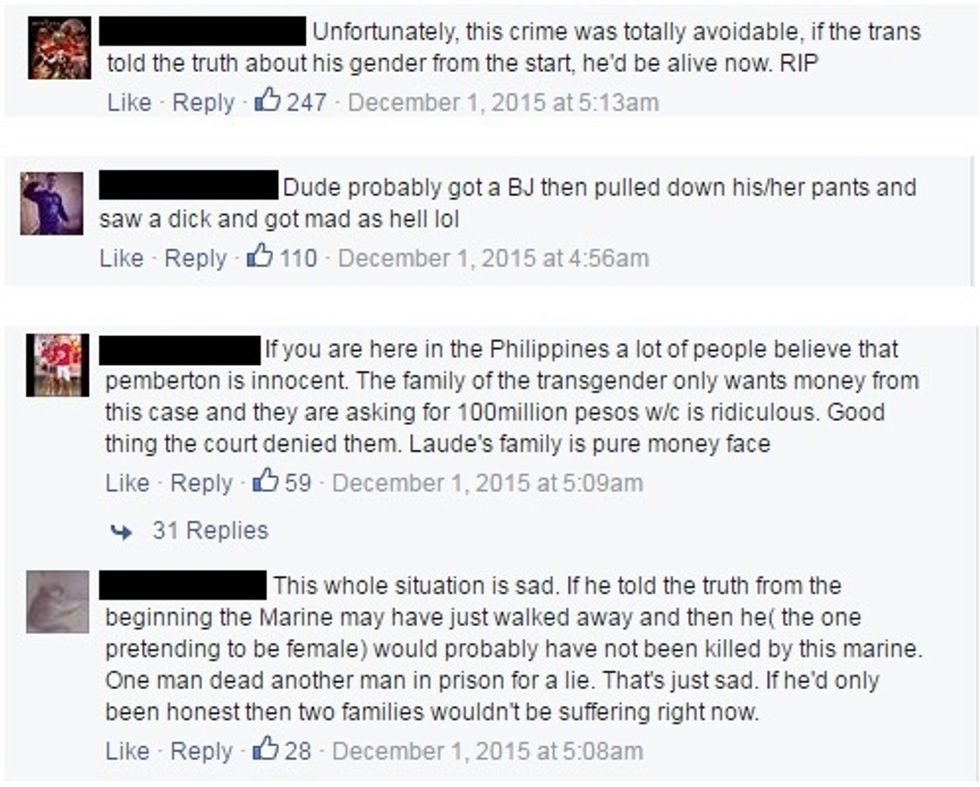 Understandably, this crime triggered a lot of outrage. But while some were outraged over the horrific nature of the crime, many others were outraged by a different detail in the story. That was because Jennifer Laude had done the unspeakable. She was a trans woman and had not disclosed that information before having sex with Pemberton. So in the minds of many cis people, her death was the price she paid for not disclosing her trans status. Here are some of the comments on CNN's Facebook page when the story broke.
