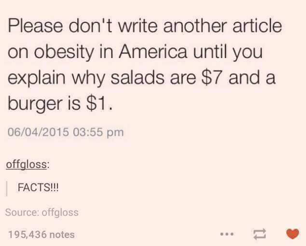 According to this whiny Tumblr post, it is cheaper to eat fast food burgers than salads. It also implies that food prices are the root cause of obesity in America when that is simply not the case.