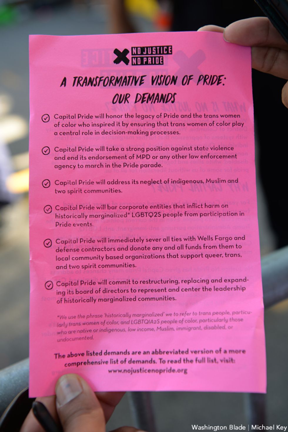 There has been a long-time rift between folks who are also people of color and, namely, the white LGBTQ+ community. Much of this stems from the blatant ignoring of the unique struggles queer and transgender people of color face, and our erasure from the movement. This was made abundantly clear at Washington D.C.'s Capital Pride about a week ago, following the one-year anniversary of the Pulse Orlando shooting. Protesters halted the parade, blocking the floats for sponsors such as Wells Fargo and Lockheed Martin (a military industrial corporation), who are complicit in violence against minority communities. After Pride organizers decided against "[centering] marginalized voices within the LGBTQ2S community and [removing] Metropolitan police and corporations who profit from pipelines and war such as Wells Fargo and Lockheed Martin..." #NoJusticeNoPride protesters formed at least two blockades during the parade. With signs reading everything from "Wells Fargo = Native Genocide: Private Prisons & Immigrant Detention," to, "No Pride In: Prisons, Pipelines, Deportations," to, "No Pride in Police Violence," they brought the march to a complete stop in order to make their voices heard.