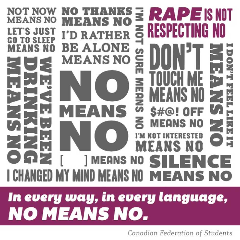 Think about consent in the simplest terms. For example, Sally has this new tea she wants everyone to try. She asks Ben to try her tea, but Ben says no. At this point, Sally should accept Ben’s answer and leave him alone about the tea. After Ben says no, Sally does not have the right to try to force Ben to try her tea. Whether that be her asking again, pressuring him to or even forcefully shoving her tea in Ben’s mouth. At this point, it should be clear that doing something to someone without their consent is wrong. Sadly, it's not clear.