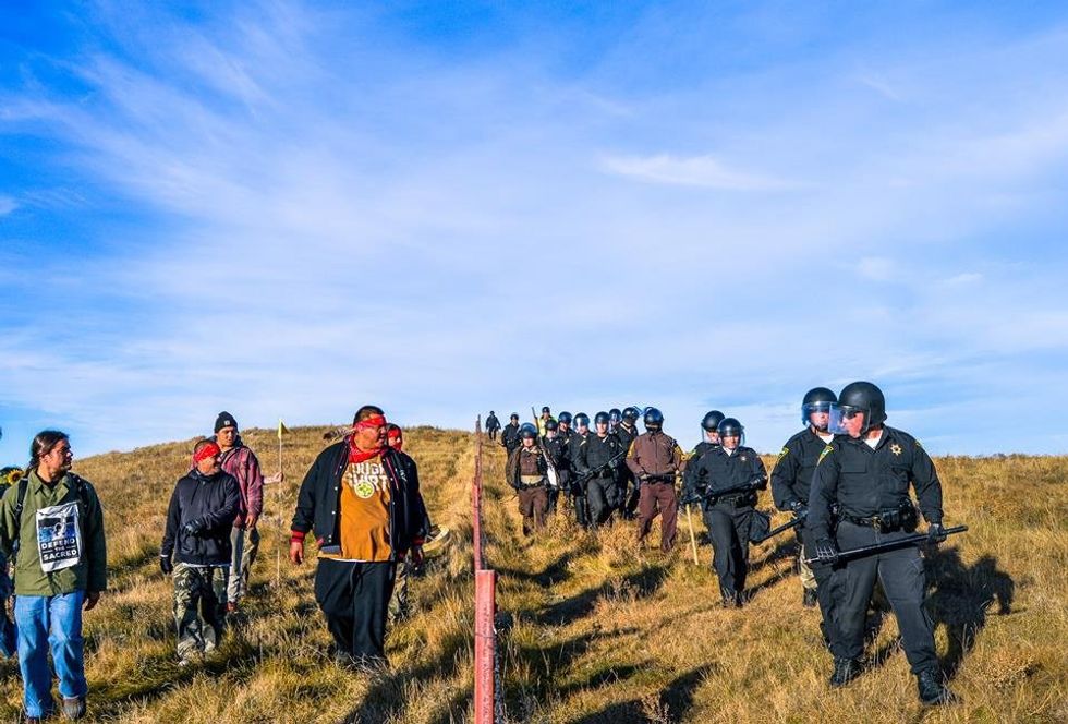Here's the thing, the Natives in the area have been protesting the construction of the Dakota Access Pipeline since April, they are the Water Protectors. And since October 10 things have escalated very quickly between the riot police and the peaceful protesters as construction gets closer to the water. Protesters have been roughly handled, shot at with rubber bullets, bones have been broken, they have been tased and pepper sprayed, and hundreds have been arrested for "trespassing" on their own land, yet they have not had any weapons on them. The indigenous people protecting water for more than just themselves but all of the people and animals affected by the Missouri River are being treated more harshly than the Oregon Militia who were just acquitted for an armed standoff lasting 41 days starting this last January!