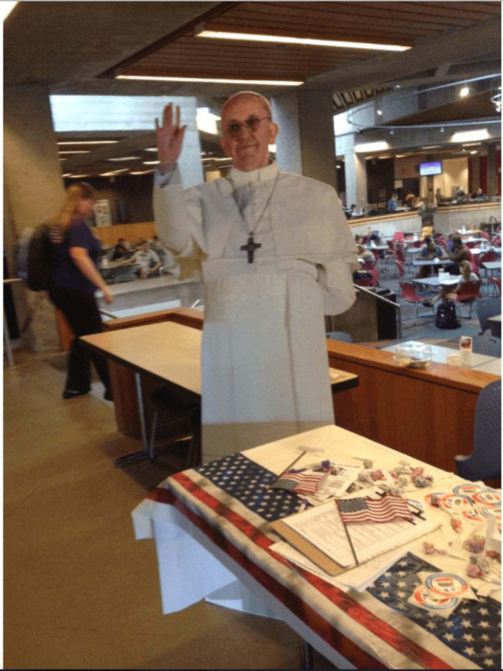 - The Pope’s all about voting. In Maucker Union, there was a voter registration booth set up. Voting helps shape public policy and promote the common good.