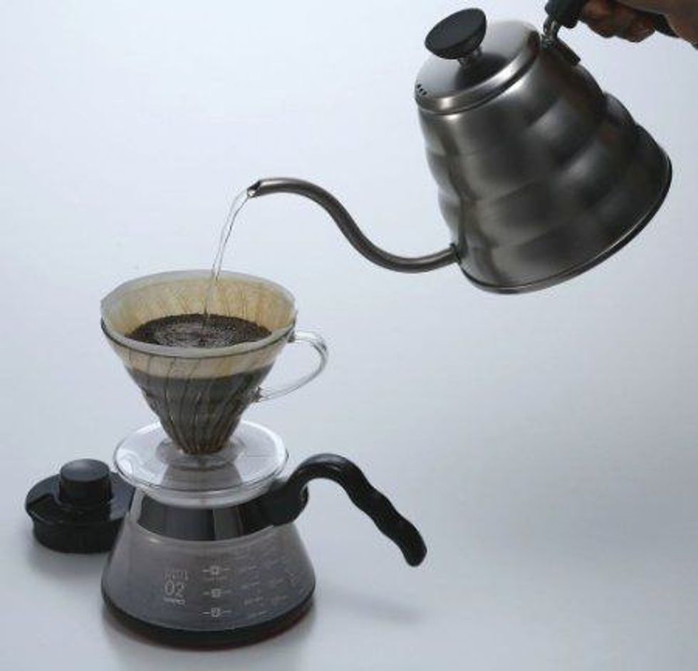The V60 method is basically the same as an automatic drip, but it uses a smaller amount of grounds, like a hand press, and the grounds are pre-wetted before starting the drip. This “bloom” allows the grounds to release excess gases, so their full flavor can be absorbed into the rest of the water when it is poured in. The narrow filter and grooved cup filters the water gently downward, picking up all the flavor it can along the way. The V60 requires more technique because the temperature of the water, the texture and size of the grounds, and the speed of the flowing water can all affect how the coffee tastes. But it is still easy to use and utilizes all of the grounds, rather than pressurizing a small amount for less full flavor.