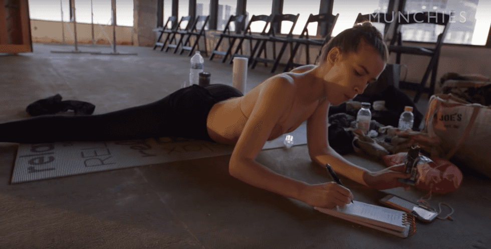Farrell portrays her lifestyle of constant motion and intake as a healthy way to stay in shape. She is only eating processed foods because the calories are easier to track. She is never seen in the video eating without some other sort of distraction occurring simultaneously, whether it’s stretching, icing her feet, or talking with friends. You never see her devote time to the act of consumption. She has a food scale in her kitchen and weighs out her cereal to the half gram. Farrell portrays this relationship with food as normal, and that’s what scares me the most.