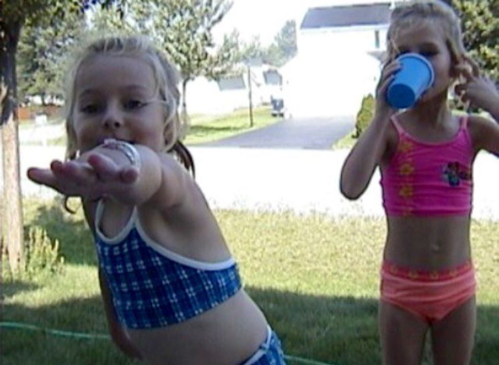 My childhood friend and me playing outside. I'm in the pink swim suit of course.