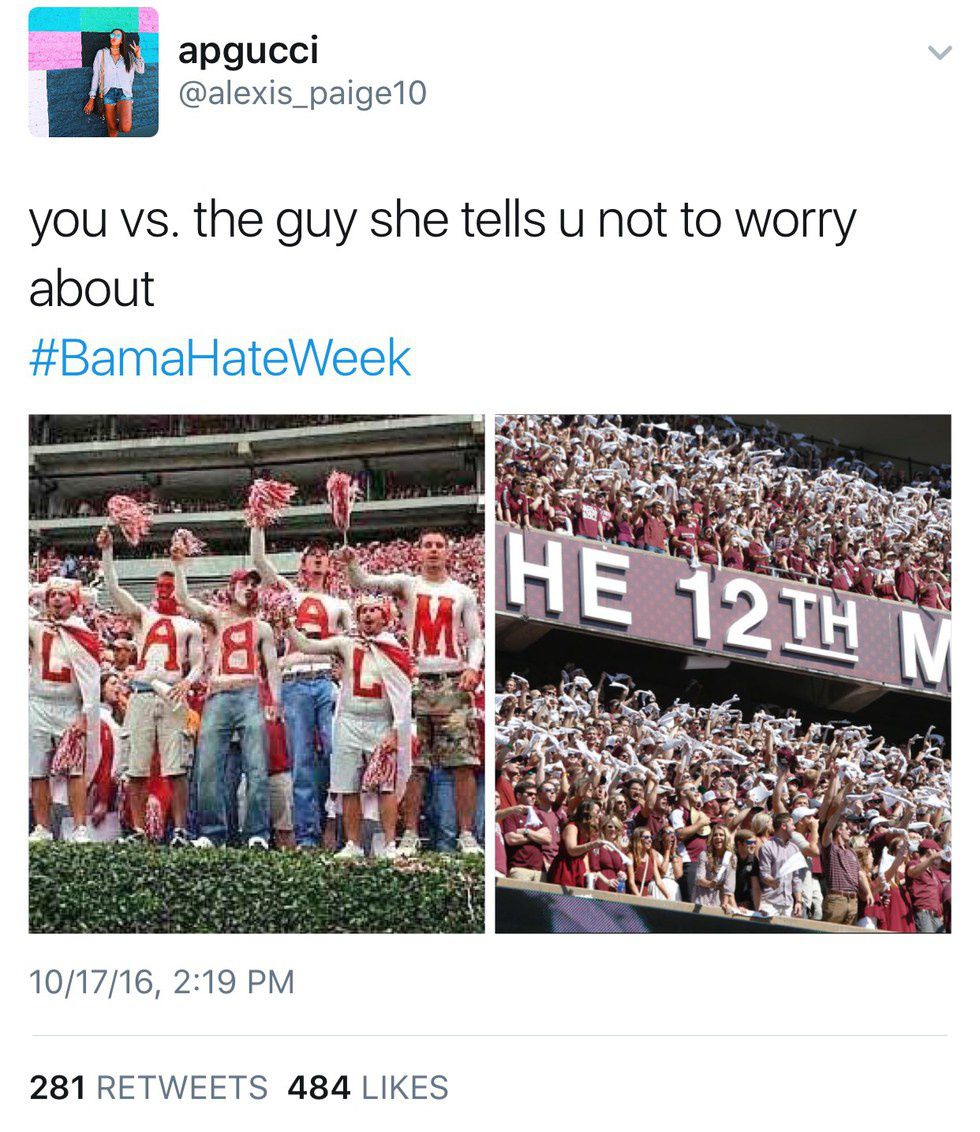 Fall in the south revolves around one thing and one thing only… college football. The SEC is regarded as the most accomplished American athletic conference in terms of national championships. Football is far more than a sport, it's a way of life. The lines are drawn in a house divided at kickoff, and families are torn apart by rivalries. Our mothers tried their best to raise well behaved ladies and gentlemen, but southern hospitality is put on hold for three months come September. From over the top tailgating in Oxford to standing with the 12th Man at Kyle Field, each and every school has its traditions. However, we put our differences aside to pick up the pitchforks and torches to rally against public enemy number one, The Crimson Tide. The University of Alabama is a football dynasty, and while many loyal fans would argue that our hatred for houndstooth stems from jealousy, that couldn't be further from the truth. What do we have to be envious of? Missing teeth, incestuous relationships, a below average I.Q.? For crying out loud, Forrest Gump is U of A's most notable alumnus; it's almost too easy for us. We might not have BTHO Nick Saban and his minions this past weekend, but there's always next year. These were some of the highlights of Bama Hate Week 2016...