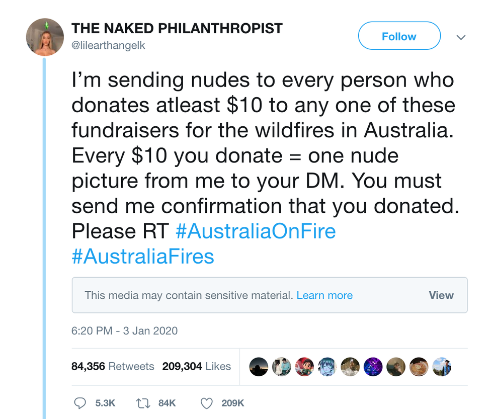 This woman was able to raise upwards of $700,000 for charity to aid the victims of Australia's massive bushfire crisis by sending nude pictures of herself through DM to anyone who donates at least $10 to the cause.