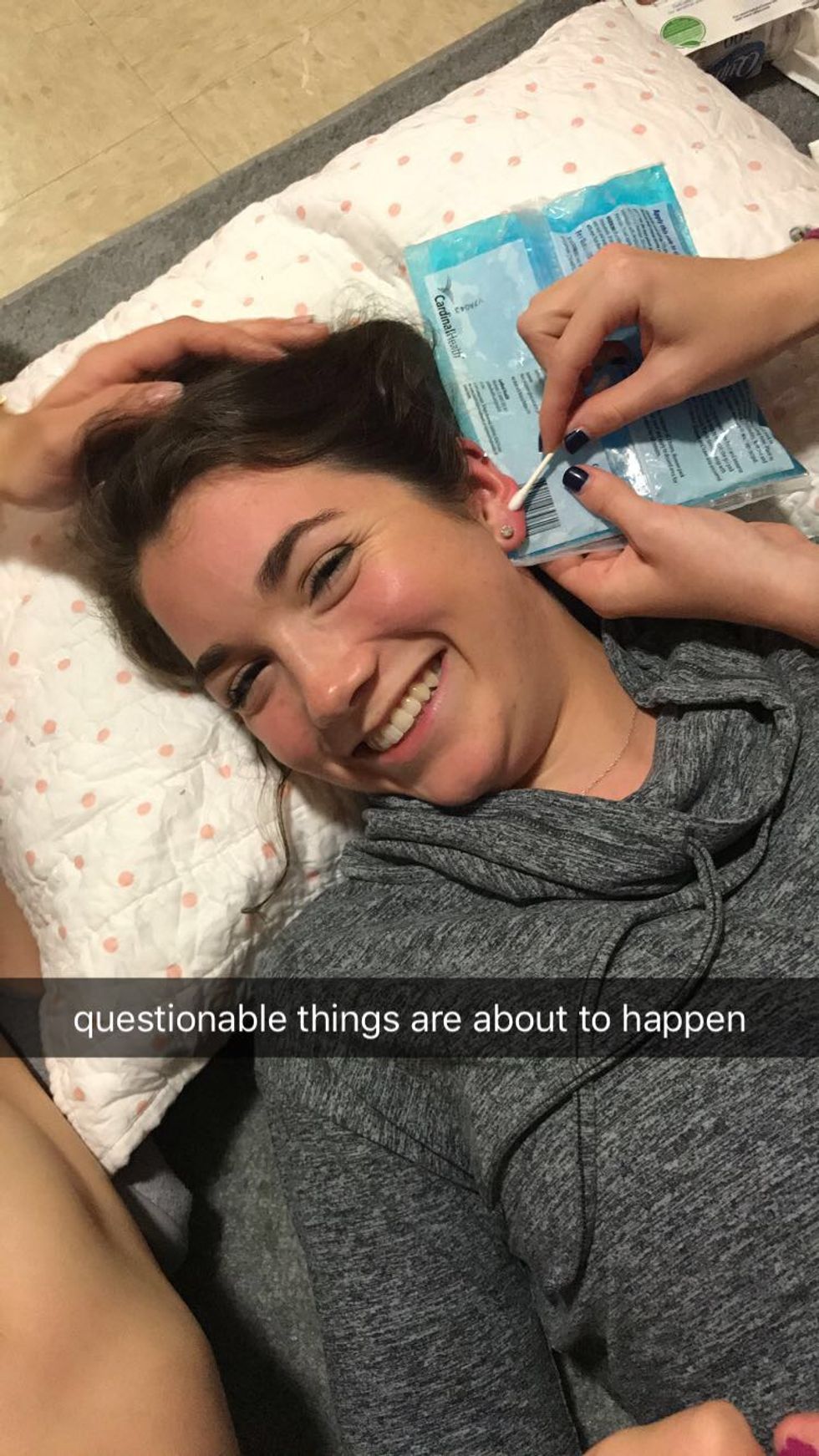 Well...this one may NOT be highly encouraged, but there is no one I (or my roommate in this case) would trust with being more sanitary when it comes to DIY piercings.