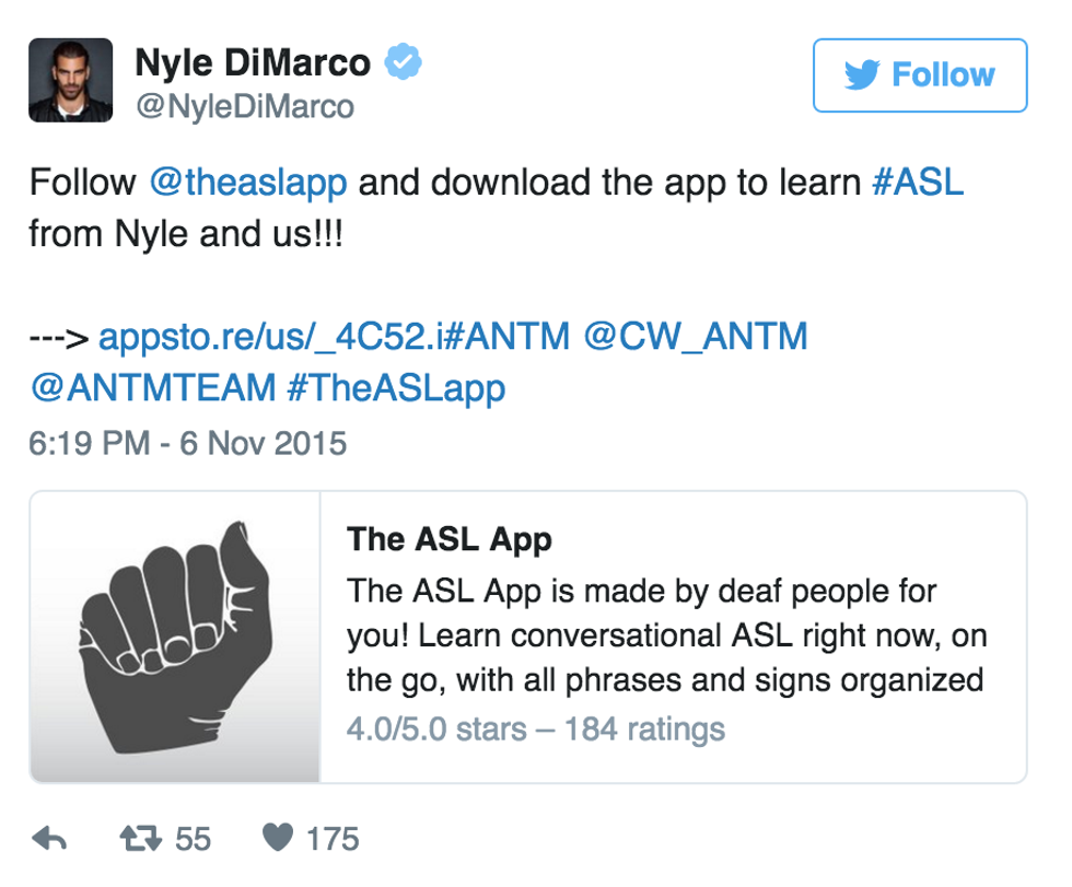 On episode 13 of ANTM, the models were responsible for showing their business skills, prompting Nyle to introduce the world to the concept of "Sign That," an app that helps teach people how to sign. Although this idea did not win him the challenge (he lost to a tanktop-sock combination called Tocks), that was not the end of this idea. After that episode aired, Nyle took to twitter to announce his decision to join "The ASL App" to help teach ASL.