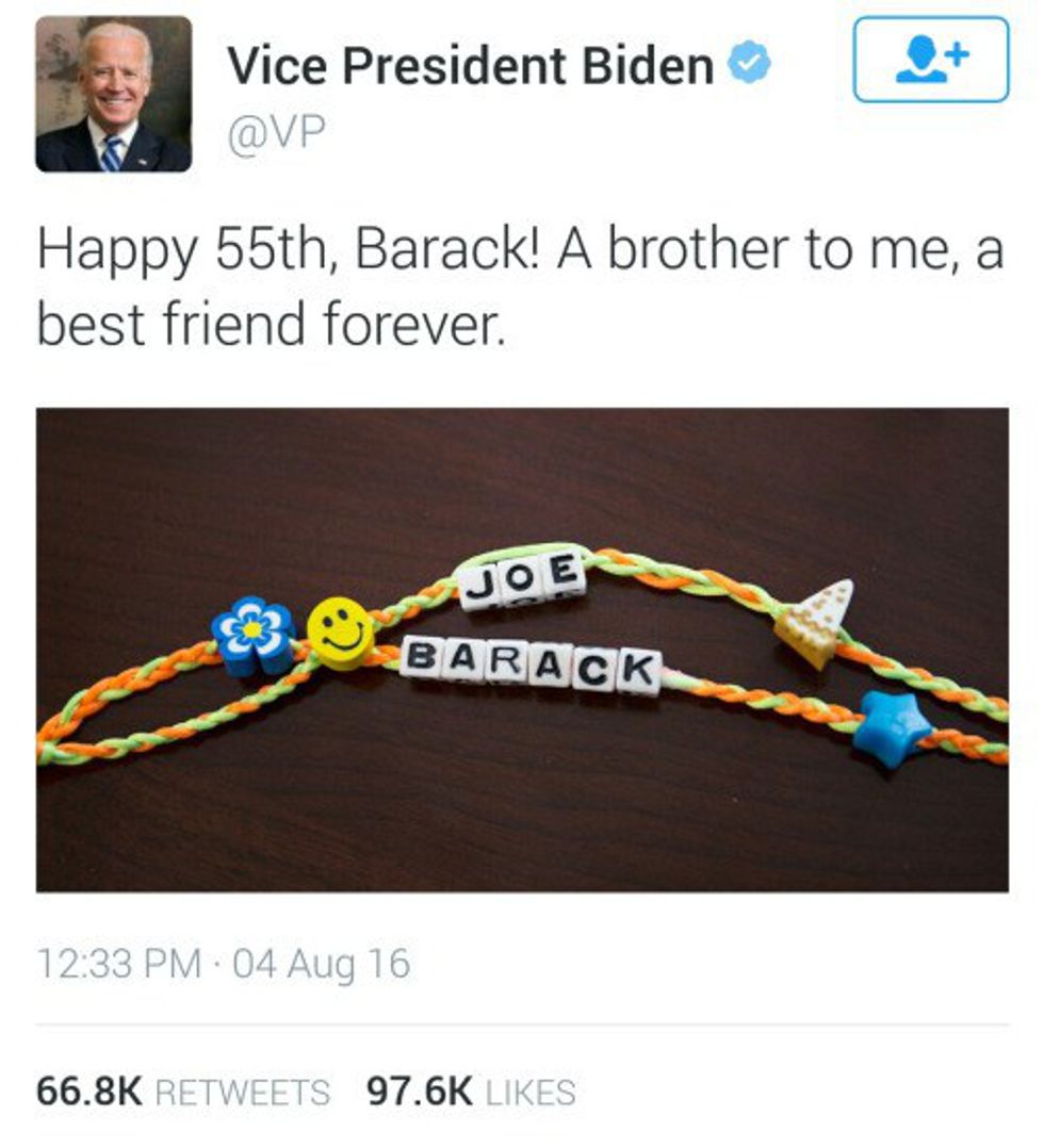 For President Obama's 55th birthday, Vice President Biden shared this precious picture with the world via Twitter of the pairs friendship bracelets.
