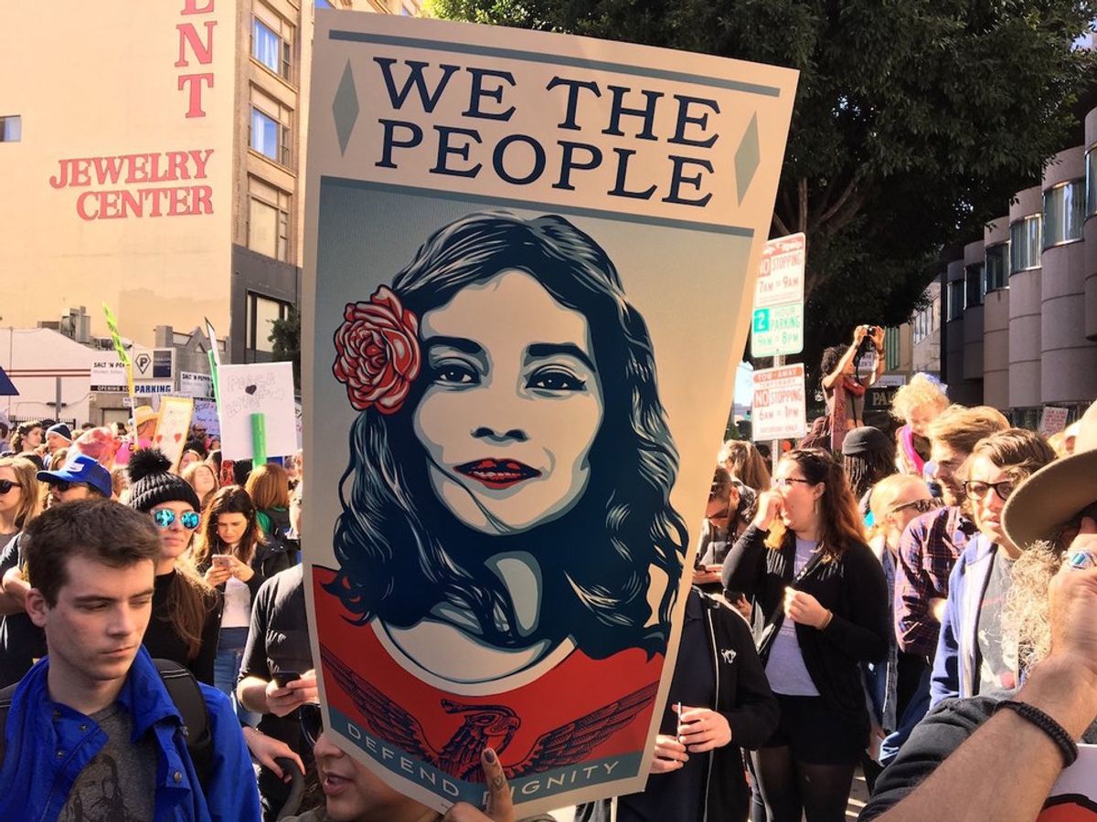 Fairey started designing anti-corporate art around 1989, later emulating artists like Banksy and Barbara Kruger, as well as brands like Supreme. Street art was a huge inspiration, with Fairey's "Andre The Giant" showing up in spray paint or stickers around urban areas. Nowadays OBEY's art is commissioned to be displayed on buildings, so the sneaky graffiti aspect isn't as big as it was back then. Fairey's OBEY brand is almost a household name, now: he works with a diverse range of artists to produce new art, the most recent being the Amplifier Foundation, who helped produce posters that became very popular at the Women's March this year. OBEY has also designed album art, skateboards, and just about any other kind of street-worthy merch you can think of. The striking contrast of the colors is instantly recognizable, like a 21st-century version of wartime propaganda posters.