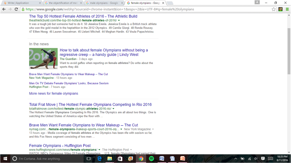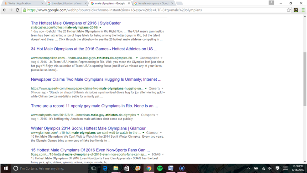 I watch and read Cosmopolitan's Discover Snapchat Story almost every day. When the Olympics began, I noticed a shocking increase in posts about "hot guys," especially the olympian kind. Every day, Cosmo posts an "Olympic Hottie Of The Day" that pictures a shirtless male olympian and his name. In addition to the Hottie Of The Day one day, there was an article titled, "Why It's OK To Objectify Men's Bulges." Infuriated, I took it upon myself to Google "male olympians" to see what came up. Here's what came up: