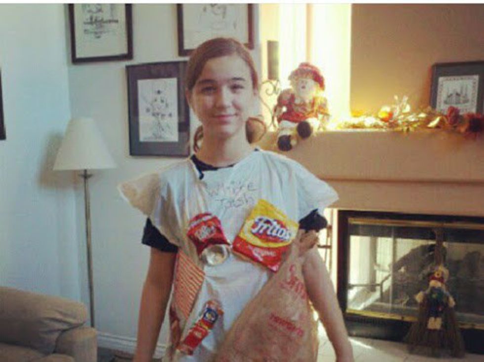 I didn't fail on my promise, and the next year I came up with an amazing idea to be “white trash” (which I totally stole from the Internet.) I got a Coors Light hat, a trash bag with the holes on the sides and top for my head and arms, and tons of trash taped all over it. I thought it was the most hilarious and edgy thing I had ever done, but when I got to school, I got the same reaction as the year before: no one got the joke.