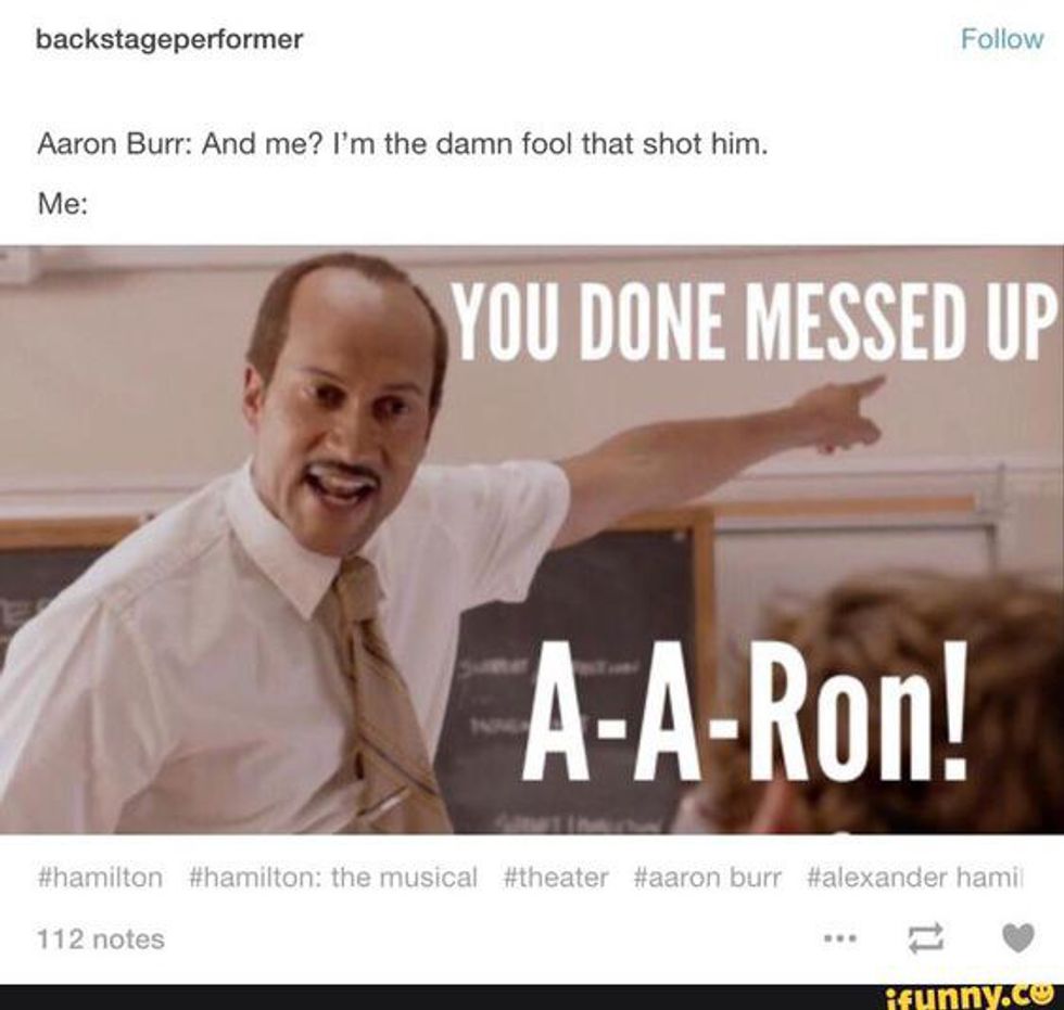 I say, A. Burr, "the fact that you're still alive is a miracle." I know that refers to your old orphan buddy A. Ham, but you are in just as much trouble.