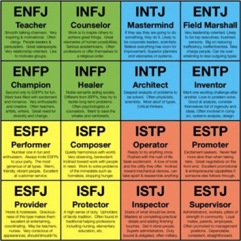 This is the Myers-Briggs Type Indicator Chart. Anyone who takes the Myers-Briggs Test will receive one of these 16 results telling them what type they are. But before diving in, there are a few disclaimers about this chart.